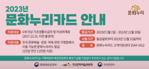 - 문화예술, 국내여행, 체육활동을 지원하는 바우처입니다. 작년까지 지원금액이 10만 원이었다가 올해 11만 원으로 인상되었으며, 내년에는 13만 원으로 늘어납니다. 아쉽게도 올해 신청분은 2023년 11월 30일 오후 6시에 마감이 되었지만, 또 내년이남아 있으니 알아 두셨다가 신청 기간에 맞춰 신청하시면 도움이 됩니다.