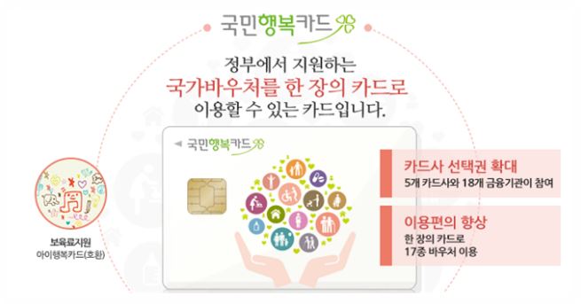 국민행복카드는 국가바우처 통합카드로 카드 한 장으로 총 17가지의 국가복지 바우처 혜택을 받을 수 있습니다.