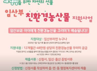 - 신청 방법: 방문: 주소지 구(군) 청 방문(신청서 및 신청 서류 제출), 온라인 : 임산부 친환경 농산물 통합 쇼핑몰에서 첨부파일 첨부 후 신청