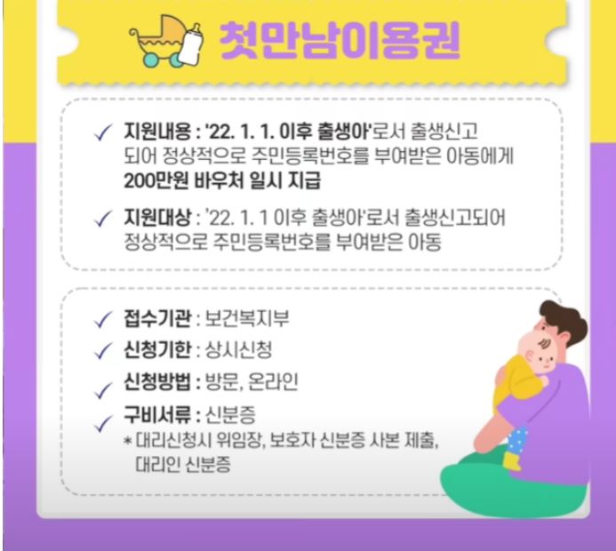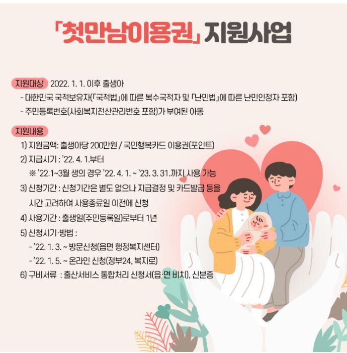 현재 우리나라 가장 큰 문제인 저출산 문제를 해결하기 위해 작년부터 시작한 '젓만남 이용권' 지원사업은 소득, 지역 관계없이 출생 아동에게 첫 만남 이용권 200만 원을 지원해 양육비 부담을 줄여주는 바우처 제도입니다. 첫 만남 이용권은 국민행복카드로 지급이 됩니다