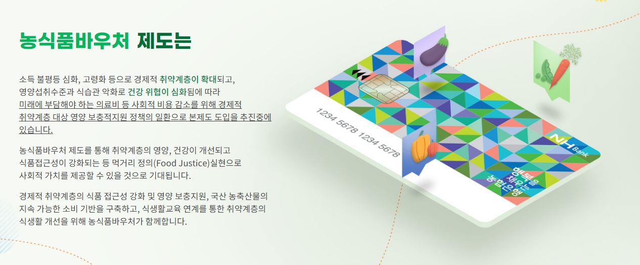 - 사용 방법: 국민행복카드를 발급받아 정부지원금으로 결제 가능한 유통점에서 바우처로 구매 가능한 물품을 자유롭게 구매 가능