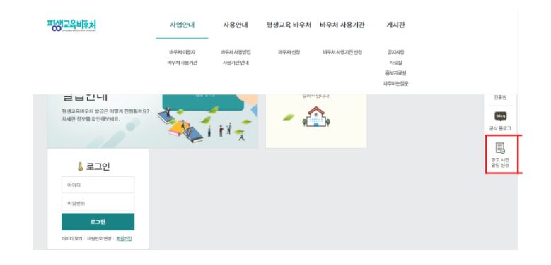 - 평생교육바우처 홈페이지 오른쪽 퀵메뉴에 공고 사전 알림 신청 클릭